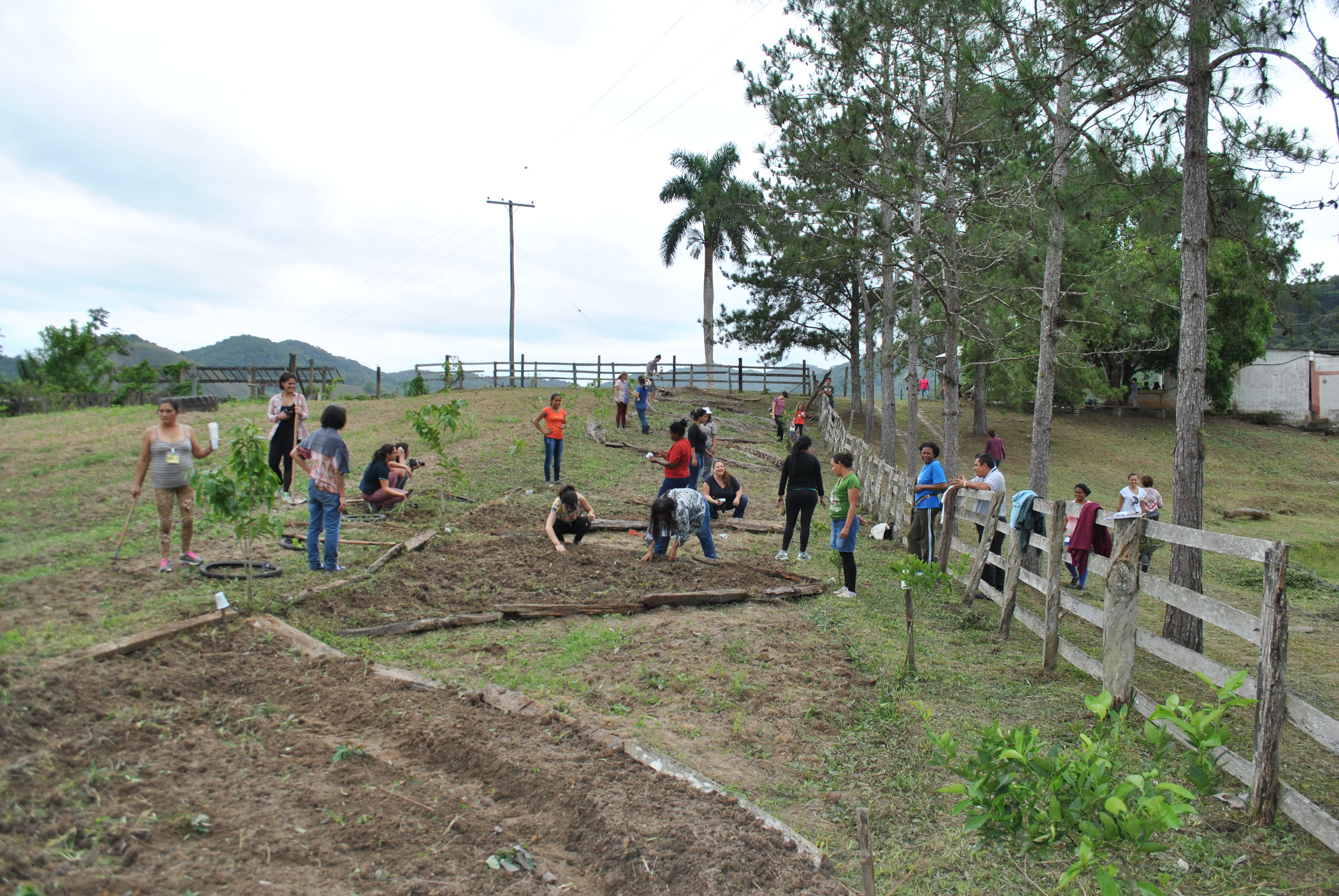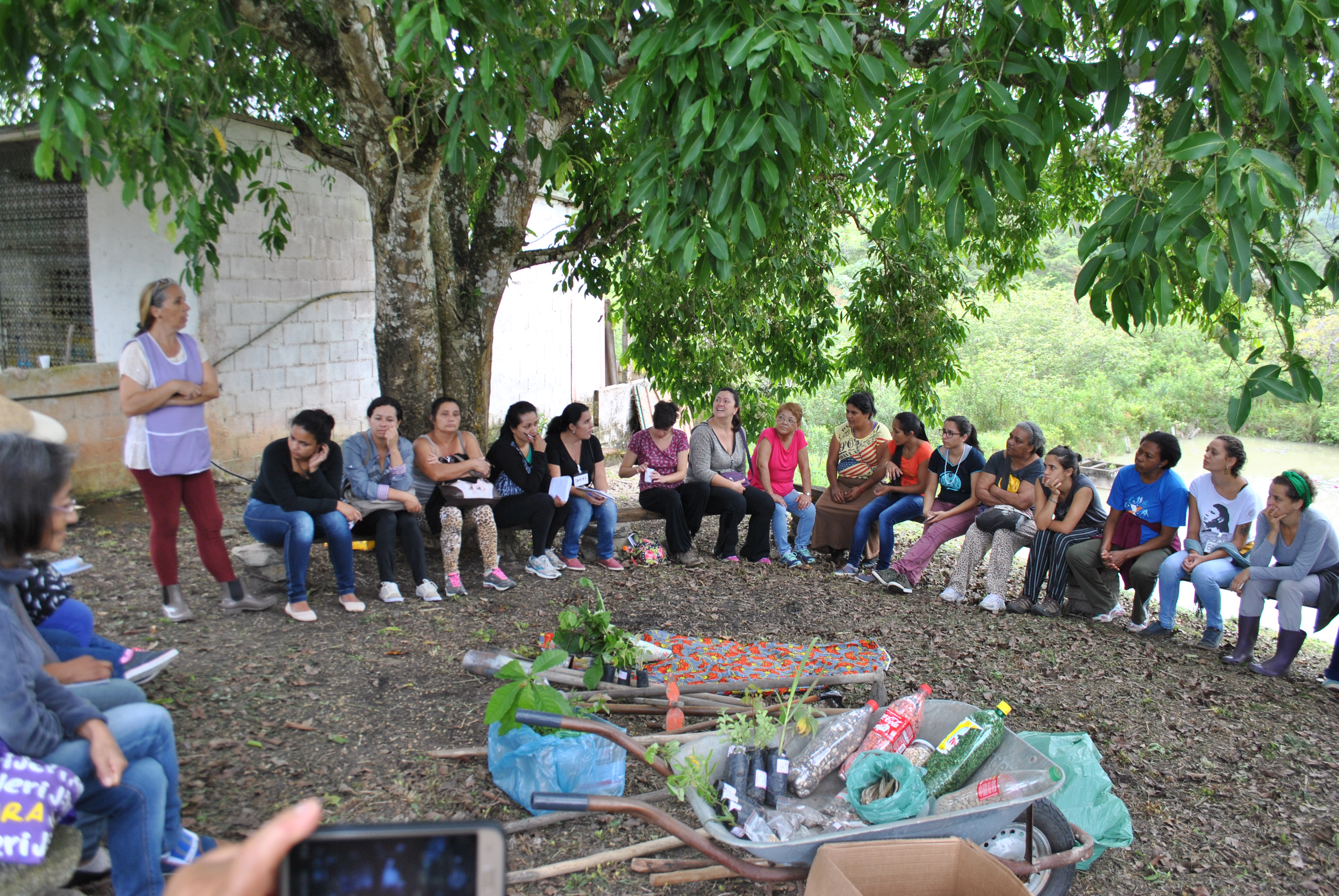 Esse debate se complementou na prática com a visita no dia 8 ao sítio da agricultora Bete, na cidade de Miracatu, onde primeiro foi feito uma formação sobre plantas medicinais e sementes com as participantes do curso e agricultoras da vizinhança. Em uma roda de conversa, ela contou sobre sua trajetória como agricultora, que toca o sítio sozinha com o filho adolescente, bem como de suas experiências também na criação de abelhas. A prática se complementou com um mutirão no qual as mulheres ajudaram Bete a implementar uma horta com um modelo de cultivo de consórcio, no qual diversas espécies são plantadas em canteiros com formato de mandala (circular).